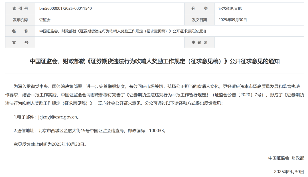 2025年9月30日掌上策略掌上策略掌上策略,中国证监会、财政部发布就《证券期货违法行为吹哨人奖励工作规定(征求意见稿)》公开征求意见的通知。
